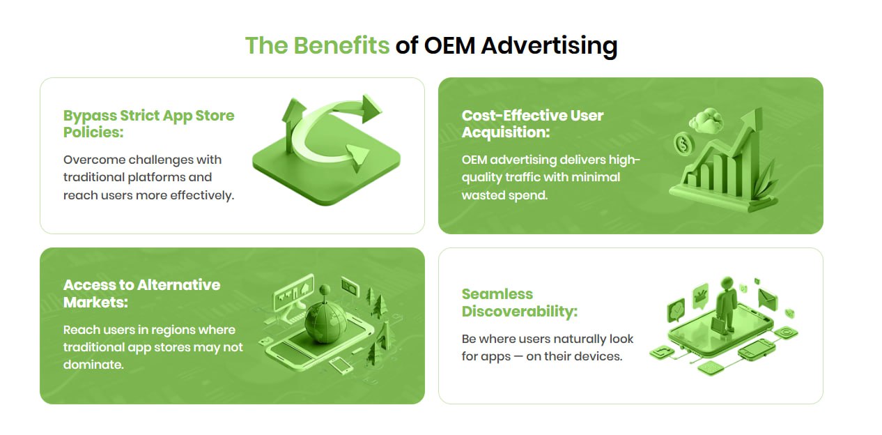 Ще один напрям, де агентська модель дає відчутну перевагу, — OEM-реклама для APK-додатків. Цей формат дозволяє просувати мобільні продукти через екосистеми виробників пристроїв і альтернативні сто́ри, що суттєво скорочує час виходу на ринок..