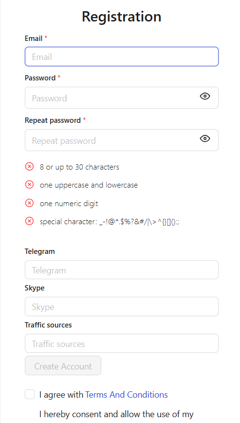 Для початку переходимо на сайт, де нас зустрічає класичне вікно реєстрації – заповнюємо всі поля, зокрема  вказуємо контакти для зв’язку.