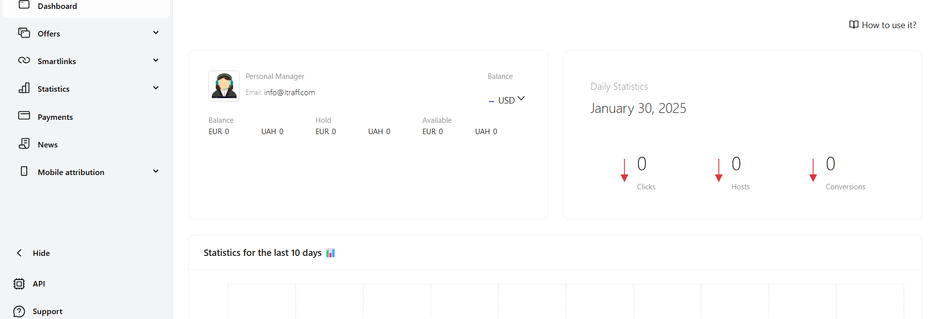 Далі вам треба трохи зачекати, допоки менеджери підтвердять вашу заявку – зазвичай це займає не більше 15 хвилин. Після цього отримаєте доступ до панелі партнерки. І тут усе насправді дуже просто та зрозуміло. На головній сторінці – загальна статистика та контакти особистого менеджера.